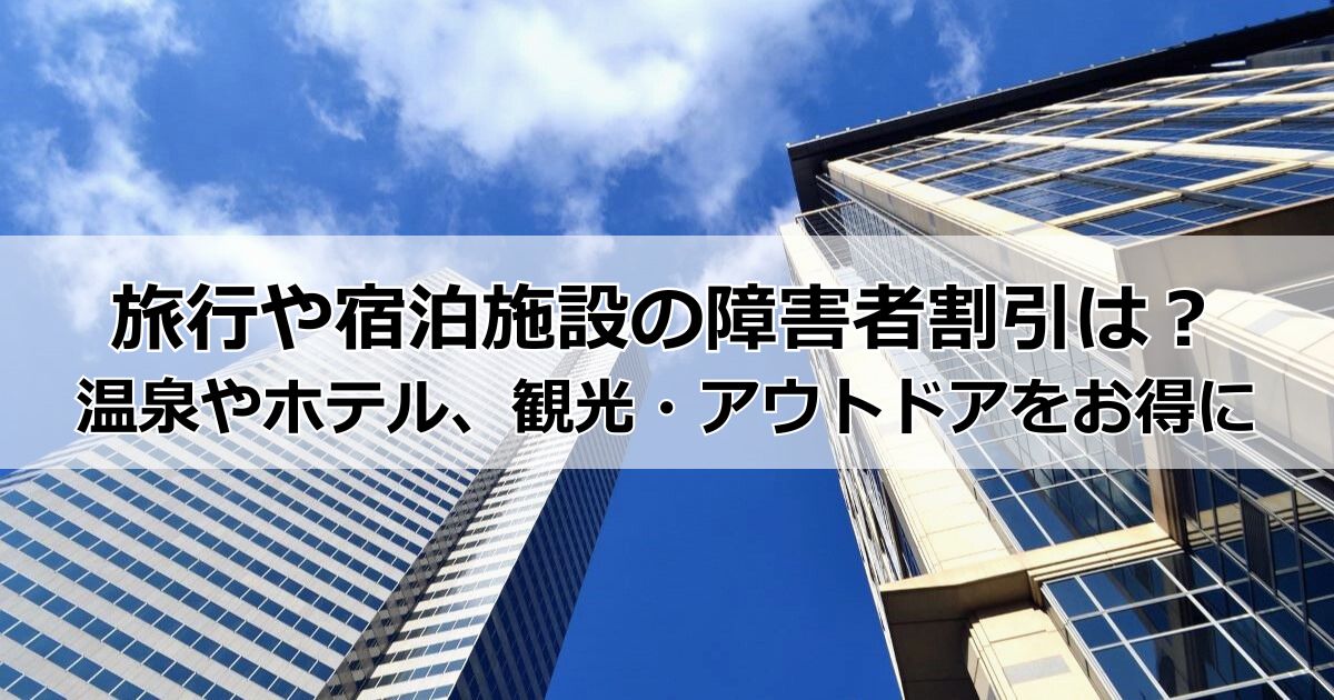 旅行ツアーや宿泊施設の障害者割引はある?温泉やホテル、観光・アウトドアをよりお得に利用温泉やホテルなどの宿泊・休養、旅行にまつわる施設やサービスなど。 しかしながら、民間の旅行ツアーや宿泊施設の利用における障害者向けの割引対応は多くありません。 それでも旅行や宿泊の際に、少しでも費用負担を軽くできる手段や使いやすいサービス...