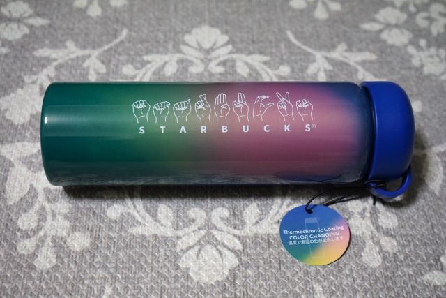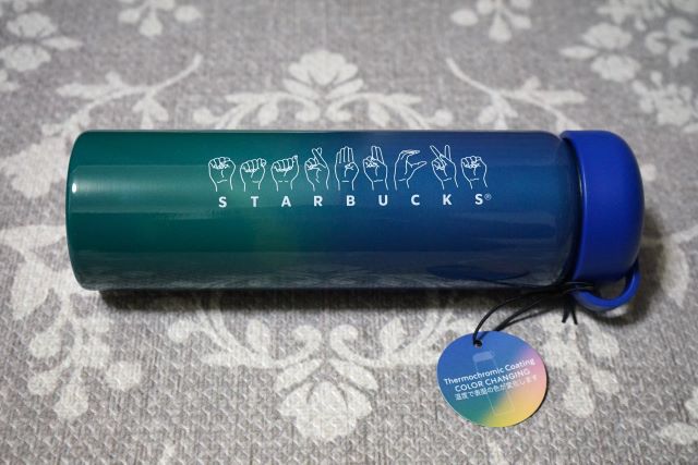 サイニングステンレスボトルは、表面にSTARBUCKSを指文字(American Sign Language)で表現したサインデザイン、裏面の下方に「ありがとう」を意味する手話のイラストがあしらわれているのが特徴です。